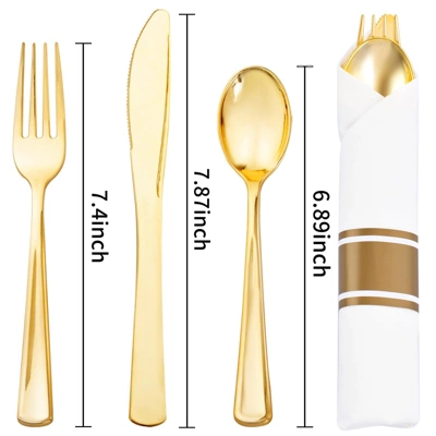 Itopfox 100-Pack Gold Plastic Cutlery Set With Napkins – Disposable Gold Utensils For Weddings, Parties, Thanksgiving – Includes Forks, Knives Spoons