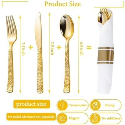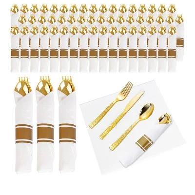 Itopfox 100-Pack Gold Plastic Silverware Set Disposable Cutlery With Forks, Knives, Spoons & Napkins, Elegant & Durable For Parties, Events, Banquets
