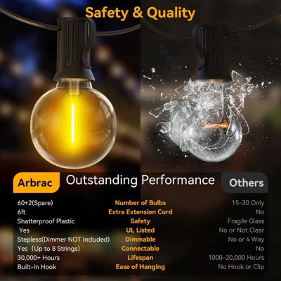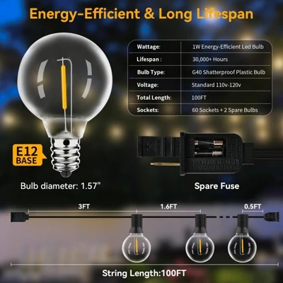 Elevate your living spaces with these remarkable 100ft outdoor string lights! Featuring 62 shatterproof LED bulbs, these lights are a cut above the rest. The high – light transmittance plastic bulbs are not only shatter – resistant and wear – resistant but also come with an IP44 waterproof rating, meaning they can brave all kinds of weather. You can connect them end – to – end to cover a larger area and customize the length as per your requirements. They are dimmer – compatible (dimmer not included) and come with two spare bulbs, allowing you to adjust the ambiance easily. Whether it’s a backyard BBQ, a romantic dinner on the patio, a birthday party, or a nighttime pool party, these lights with their warm white glow will create a cozy and inviting atmosphere. UL – listed for safety, they can be used in various indoor and outdoor spaces like cafes, bistros, pergolas, bedrooms, and living rooms. Don’t miss out on this perfect lighting solution for your special occasions and everyday living!