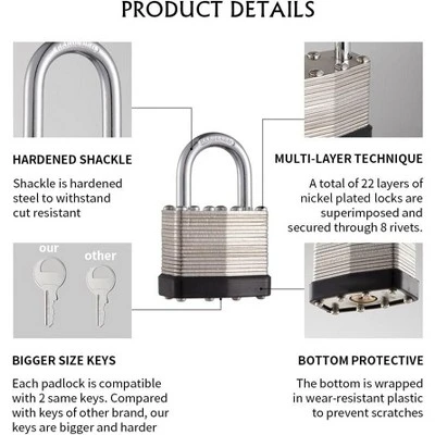 Discover our pack of 12 padlocks, perfect for enhancing security in multiple settings. Each set comes with keys that are alike, and every lock has 2 keys, making it easy to manage. Crafted from nickel – plated steel with a brass core and 4 – pin tumbler, these padlocks are resistant to tampering and weather, ensuring smooth and long – lasting performance. The hardened steel shackle can withstand long – term use and cutting attempts. With a unique design of a steel layer bound by 8 solid steel stakes and a double – locking lever mechanism, they offer top – notch security. Whether it’s for your residential gates, fences, sheds, workshops, or storage lockers, these padlocks are the ideal choice. They can also be used on tool boxes, cabinets, backpacks, and more, bringing convenience and security to your daily life.