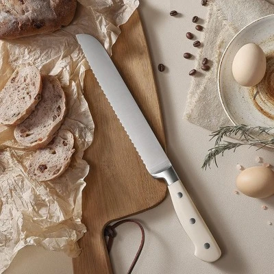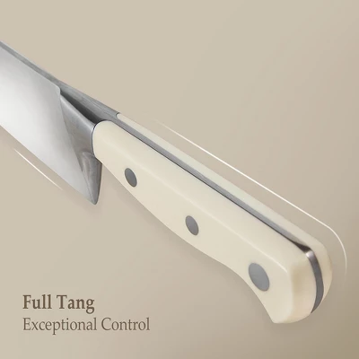Discover this 14 – piece knife set that’s a must – have for any kitchen. Crafted from high – carbon stainless steel, these knives are precision – forged for durability and stain – resistance. The precise lasers on each blade ensure an optimal cutting angle for exceptional sharpness, making food preparation quick and efficient. The triple – riveted high – impact plastic handles offer a secure and comfortable grip, and full tangs with wide bolsters provide balance and control. The set includes a variety of knives for different tasks, from an 8 – inch chef knife to a 3.5 – inch paring knife, along with a six – piece steak knife set, kitchen shears, and a sharpening steel. It also comes with a 14 – slot hardwood storage block with nonslip feet. These dishwasher – safe knives are perfect for both amateur cooks and professional chefs, bringing convenience and functionality to your daily cooking routine.