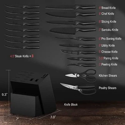 Upgrade your kitchen with this 21 – piece knife set. Crafted from 1.4116 high – carbon German stainless steel, these knives are highly resistant to stains and rust. The set includes a wide range of knives for different kitchen tasks, from chopping vegetables to slicing meat. The black non – stick and anti – rust coating on the blades ensures long – term performance. The built – in sharpener in the hard wood knife block allows you to easily keep your knives sharp with just one hand. It’s dishwasher safe, thanks to the industry – leading tapered edge grinding technology that provides optimal sharpness. Whether you’re a professional chef or a home cook, this knife set is a must – have, making your cooking experience more efficient and enjoyable.