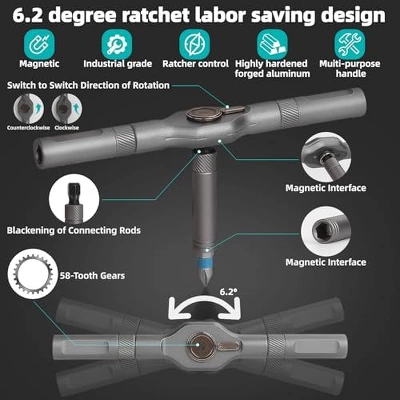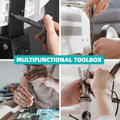 Discover this 24 – in – 1 magnetic screwdriver set, a versatile toolkit perfect for various repair jobs. With 24 professional bits catering to 5 types of screws, including Phillips, Flathead, Torx, and Hex, it meets all your repair needs. The ergonomic handle offers a comfortable grip and can also double as a mini wrench. The detachable extension rod allows for adjustable working distances, making it labor – saving. The 58 – tooth gear system enables one – handed operation with a 6.2° swing angle, maximizing efficiency and saving 80% of your energy. Its bits are crafted from sturdy and rust – resistant metal, ensuring long – lasting use. The magnetic tips and holder design securely hold screws, preventing loss. Whether it’s for home appliance repairs, fixing delicate items like mobile phones and watches, or office quick fixes, this set is your go – to. Compact and portable with an exquisite storage box, it’s always ready for any repair job on the go, bringing great convenience to your life.