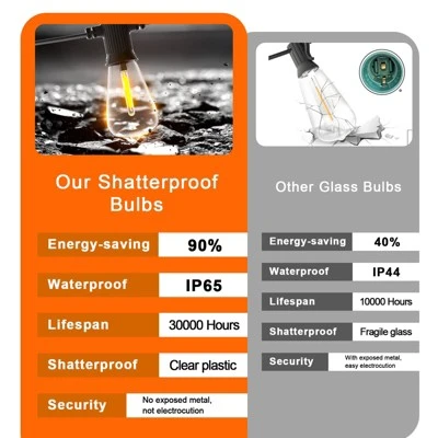 Looking for the perfect outdoor lighting solution? Our 240FT string lights are a great choice. Crafted from thick, durable modern plastics, the shatterproof ST38 bulbs are unbreakable and can endure extreme temperatures. They offer superior light transmission, unlike traditional glass bulbs. These lights are ETL – certified, ensuring safety, and are highly energy – efficient, with each bulb consuming less than 1W. They’re IP65 waterproof, so they can withstand harsh weather conditions. The dimmable warm white lights emit a steady glow, similar to incandescent bulbs, and have a 30,000 – hour lifespan. You can connect up to 7 strings end – to – end, easily lighting up large areas. Whether it’s a backyard party, a camping wedding, or a festival, these lights will create a romantic and cozy atmosphere, adding a touch of charm to your outdoor space.