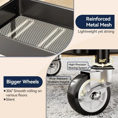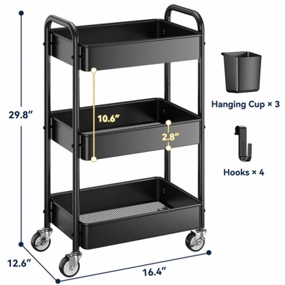 Discover a versatile and reliable storage solution! This 3 – tier rolling cart is made of 100% durable steel, ensuring sturdiness and a high load – bearing capacity of 66 LBS. Each of its 3 baskets can hold 22 pounds of items. With an ‘H’ shape dual column, it stays stable whether stationary or in motion. The expanded storage includes 3 hanging cups and 4 hooks for small items. It’s perfect for multiple uses, such as a craft cart in your hobby room, a cleaning cart in the utility area, or a snack cart in the living room. The large, heavy – duty wheels enable effortless movement, and the epoxy high – temperature baking process gives it an odorless, smooth, and chip – resistant finish. Installation is a breeze, taking only 20 minutes. This cart will bring order and convenience to your daily life, making it an essential addition to your home or office.