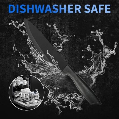 Upgrade your kitchen with this 8 – piece kitchen knife set. It’s a comprehensive set that includes an 8 – inch chef’s knife, a 7 – inch Santoku knife, an 8 – inch serrated bread knife, a 5 – inch utility knife, a 3.5 – inch paring knife, 1 kitchen shear, and a kitchen knife block. The knives are made of high – quality materials with a non – stick and rust – resistant black coating, which prevents steel oxidation and ensures a long lifespan. Each knife is carefully sharpened for smooth and efficient cutting. Whether you’re slicing, dicing, or chopping, these knives will be your great helpers. They are dishwasher – safe, so you can clean them easily and dry them for storage. The ergonomic design makes them comfortable to hold, reducing hand fatigue. Ideal for professional chefs or home cooks, this knife set will bring convenience to your daily cooking.