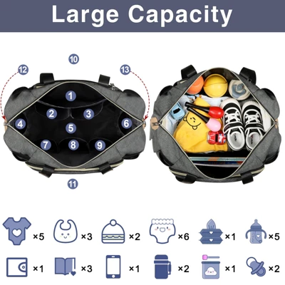 - Large Capacity & Multi-Pocket: Features a main compartment, a front pocket with 3 insulated pouches, a back wet & dry separation pocket, 8 inner easy-access pockets, and two side pockets. Wipes can be extracted from an outer hole, and velcro prevents items from falling.