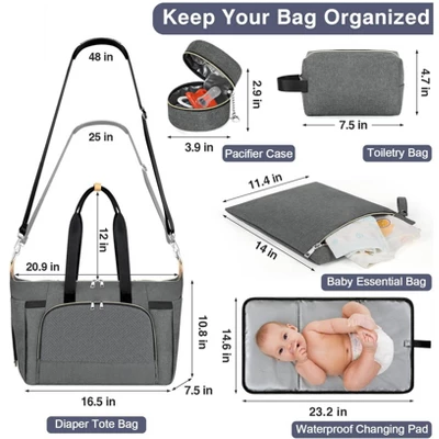 - All-in-one Set: Comes with 7 practical accessories, including a large mommy bag (16.5*14*9.4 in), a portable padded changing pad (23.2*14.6 in), a toiletry bag, an organizing pouch, a pacifier case, 2 stroller straps, and a shoulder strap. Ideal for keeping baby and mom’s necessities during travel or hospital stays.