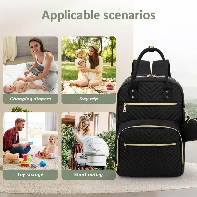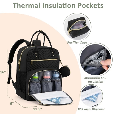 - Multiple pockets and compartments keep everything organized, enabling easy access to diapers, wipes, bottles, etc.