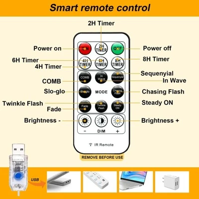 Looking for the perfect lighting for your home or event? Our curtain string lights are a great choice. With 300 super – bright warm white twinkle LEDs, these lights create a cozy and romantic atmosphere. They’re made of copper wire with a soft texture, allowing you to cut them freely for your DIY projects. The upgraded USB 8 – mode remote – control offers various lighting effects. Simply plug it into a computer, power bank, or USB interface. Installation is a breeze; no assembly is needed. Just charge it via the USB port and use the controller to select your favorite mode. It also comes with 16 sets of damage – free adhesive hooks for easy placement anywhere. The 4 timing modes and 5V low – voltage design offer safety and energy – saving benefits. Waterproof and suitable for both indoor and outdoor use, they’re perfect for Christmas, parties, weddings, and more. Transform your space with these amazing curtain lights!