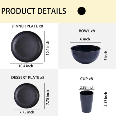 Discover this amazing dinnerware set! It’s crafted from natural straw fiber and food – grade safe materials, 100% BPA – free and non – toxic. The set includes 16 plates, 8 bowls, and 8 cups, perfect for an 8 – person meal. It’s strong, durable, lightweight, and unbreakable, so you don’t have to worry about accidental drops. You can simply toss it in the dishwasher for easy cleaning, making it reusable and cost – effective. Whether you’re having a picnic in the park, a party at home, or a camping trip, this set is your ideal choice. It’s also great for daily use at the office, school, or during travel. The sleek black design will enhance your dining experience, adding a touch of elegance to any occasion. Get this dinnerware set and enjoy a convenient and healthy dining life!