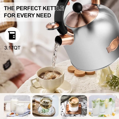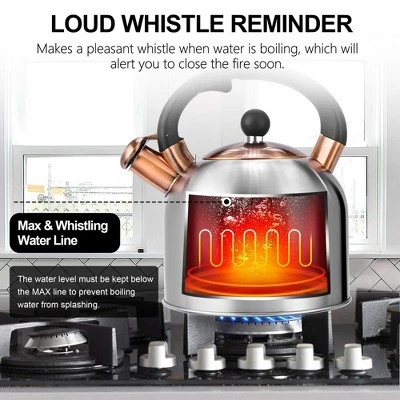 Discover the perfect whistling tea kettle for your kitchen! Made from superior food – grade 18/8 stainless steel, this 3.17 – quart kettle offers a vintage design that breaks away from the ordinary. It can boil up to 2.64 quarts of water, ideal for the whole family. The 5 – layer composite bottom ensures efficient and uniform heating, and it’s compatible with all stove types. The whistle alerts you when the water is boiled, preventing over – boiling. The handle is anti – scalding, and the easy – pour mechanism allows for one – hand operation. Whether you have a modern or retro home, this kettle will add a touch of style to your kitchen. Just use low – to – medium heat to keep it in top condition and enjoy hassle – free tea – making every day.